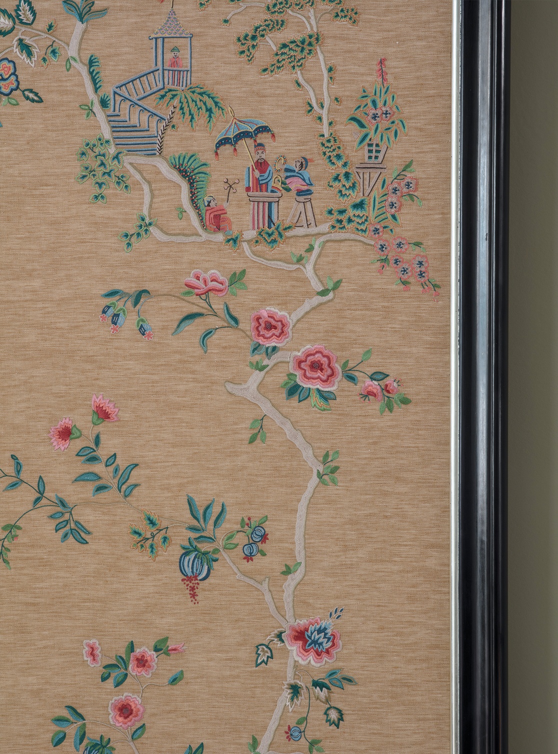 Cathay is a beautiful Chinoiserie inspired depiction of Chinese culture. The intricate decoration and classic asymmetry of this incredible embroidered art creates an oriental masterpiece.