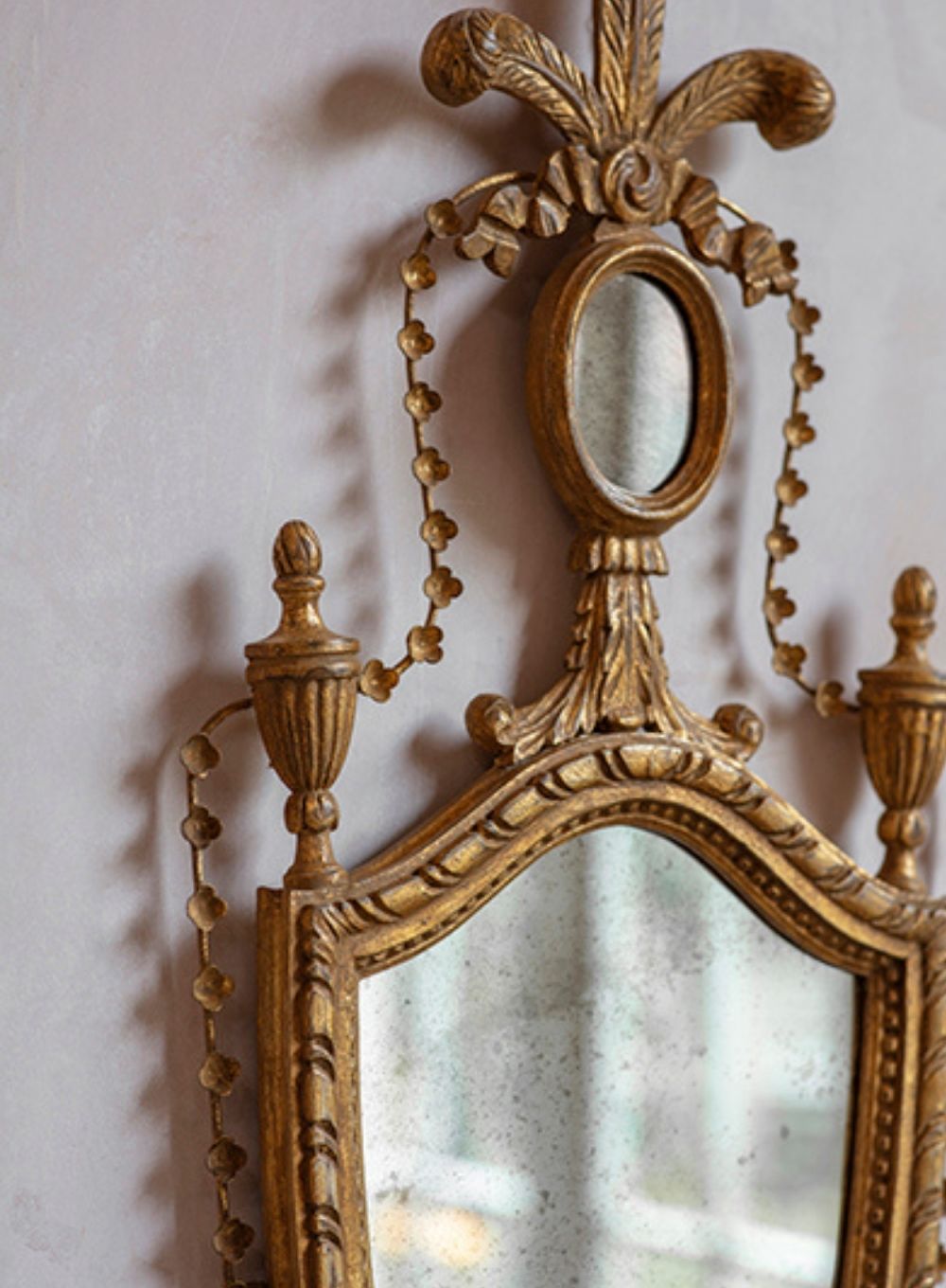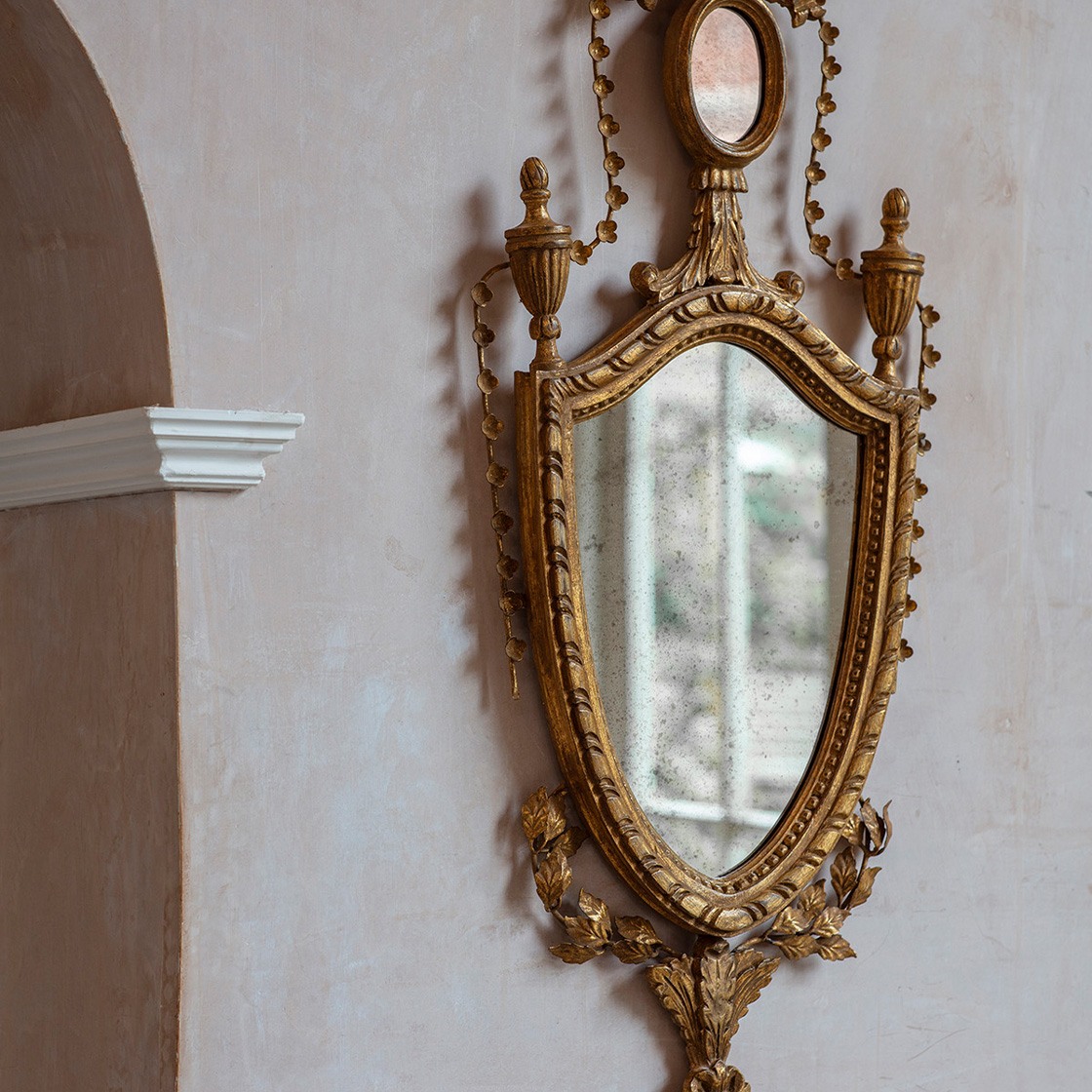 A delicately carved Regency style decorative mirror, the Catherine features typical neo-classical carved foliage, Roman urns and pendant husks, surmounted by the Prince Regent’s crest. Carved in our artisan Italian workshop, our ornate mirrors are hand gilded in a beautiful range of finishes. Pair with our decorative wall lights for a luxurious look.