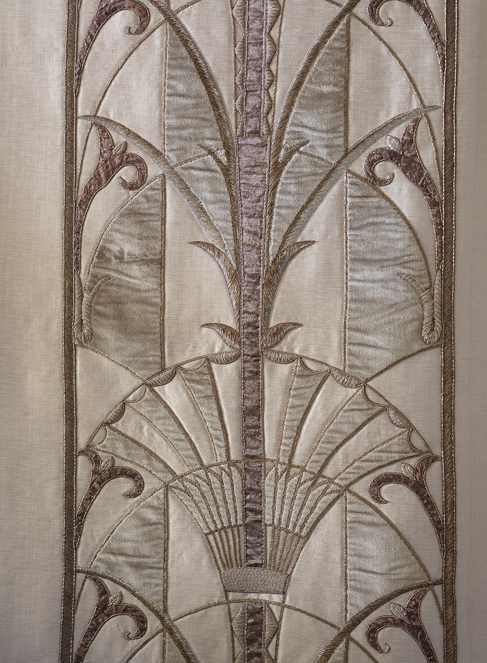 Evoking bold, decorative 1920s modernism, the Montano embroidery design has an elegant framed panel made up of geometric shapes and a fan, an iconic motif of that era, all appliqued in velvet and contrasting silks.