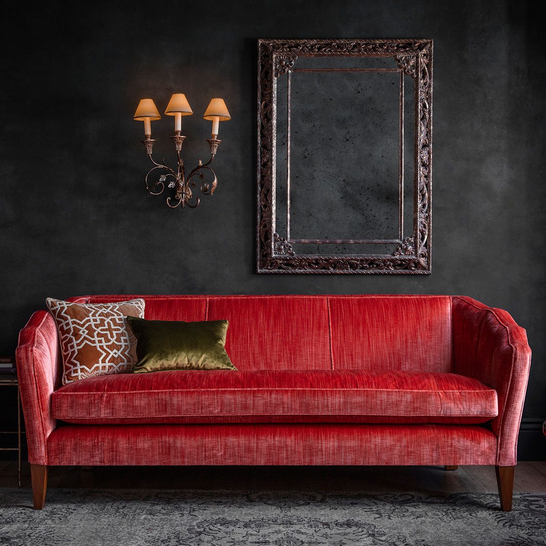 Josephine sofa in Como silk velvet - Pompeiian Red with Pisa wall light and Buckingham mirror with Habibi cushion