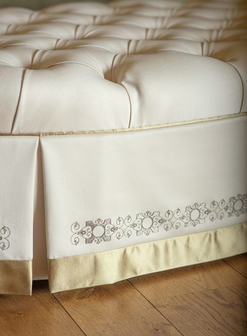 Miami headboard in Capri silk velvet - Glacier with Rockefeller embroidery, Chatsworth chandelier and Audrey embroidery on drapes