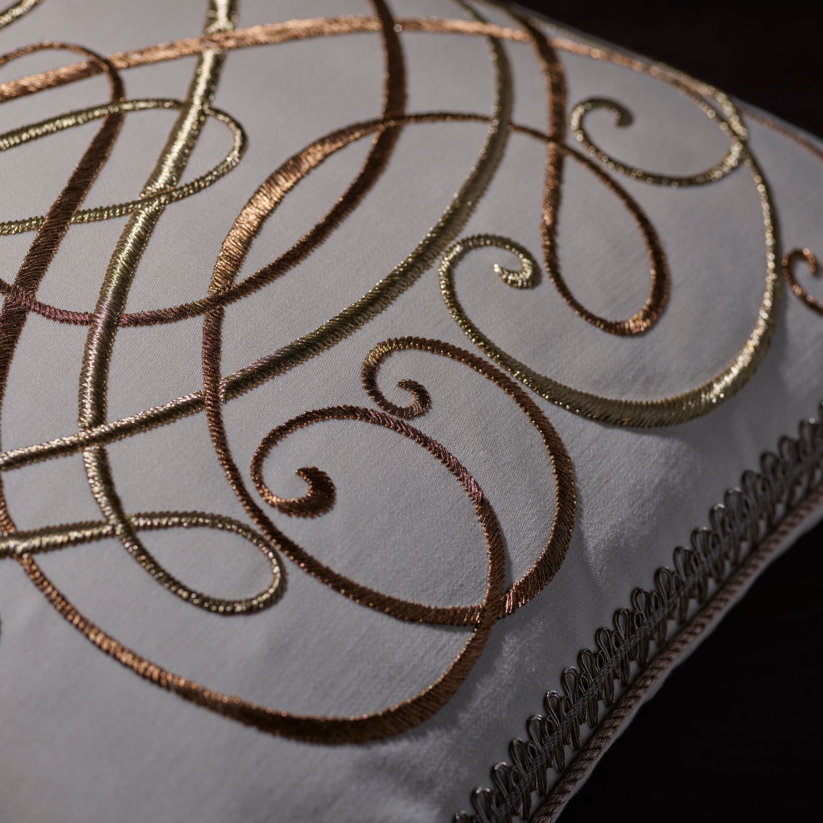 Anastasia is an elegant scrolling design, which forms a subtle heart at the centre. It is hand embroidered in metallic threads on our Eriskay wool – Cloud.