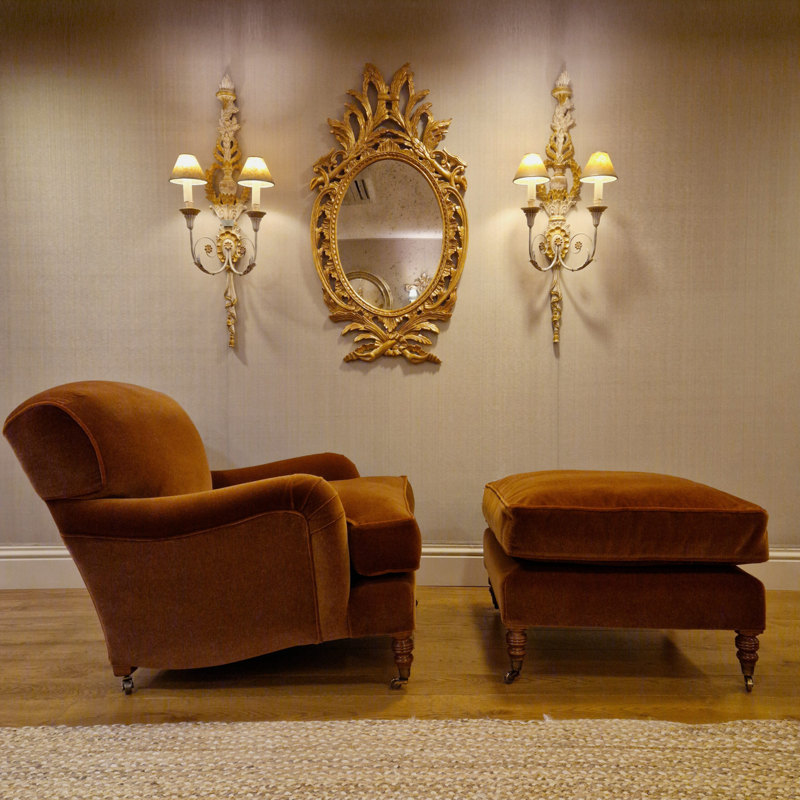 The Howard is a handsome club armchair with generous proportions, feather and down cushion, a soft sprung back and low arms. With its matching ottoman, they are a supremely comfortable. They are available as seen in Solesino mohair velvet – Brown.